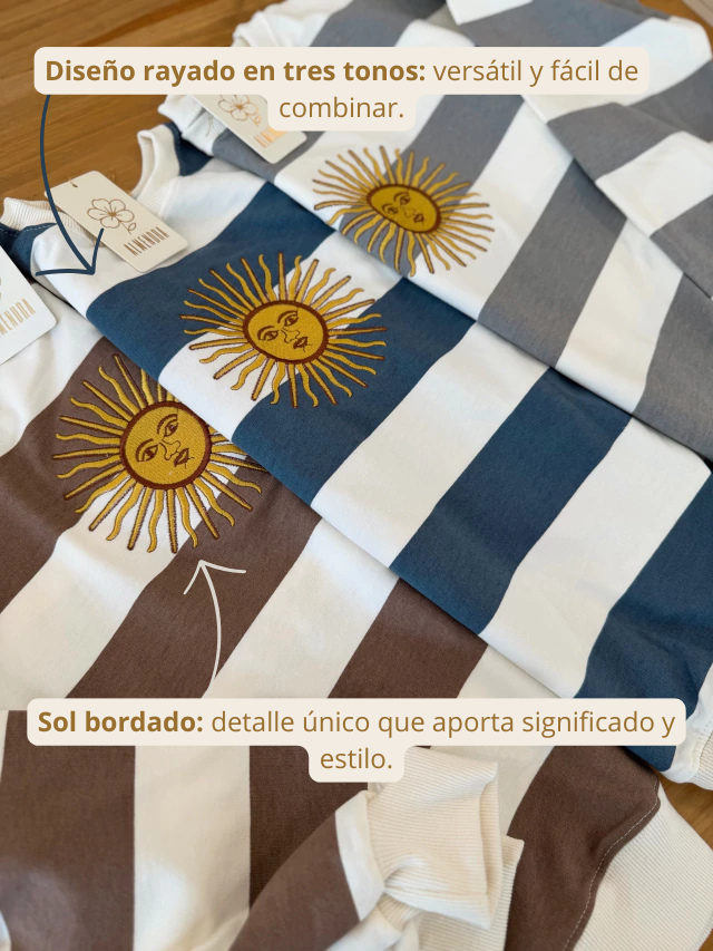 Este Buzo Patria está confeccionado en algodón rústico rayado, disponible en tres tonos que evocan la esencia de Argentina. Su diseño incluye un delicado sol bordado que representa la identidad nacional con un toque moderno y elegante.