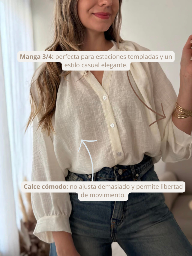 Esta camisa blanca básica de manga 3/4 es un clásico imprescindible en cualquier guardarropa. Su diseño simple y elegante la convierte en una prenda ideal para usar tanto en looks casuales como en combinaciones más formales.