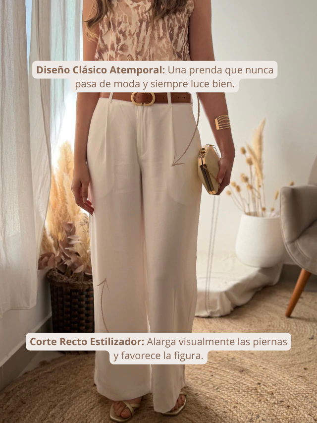 El Pantalón Andorra blanco es la prenda esencial para un look impecable. Su corte recto estiliza la figura y su tela de alta calidad garantiza confort tanto para el día a día como para ocasiones especiales.